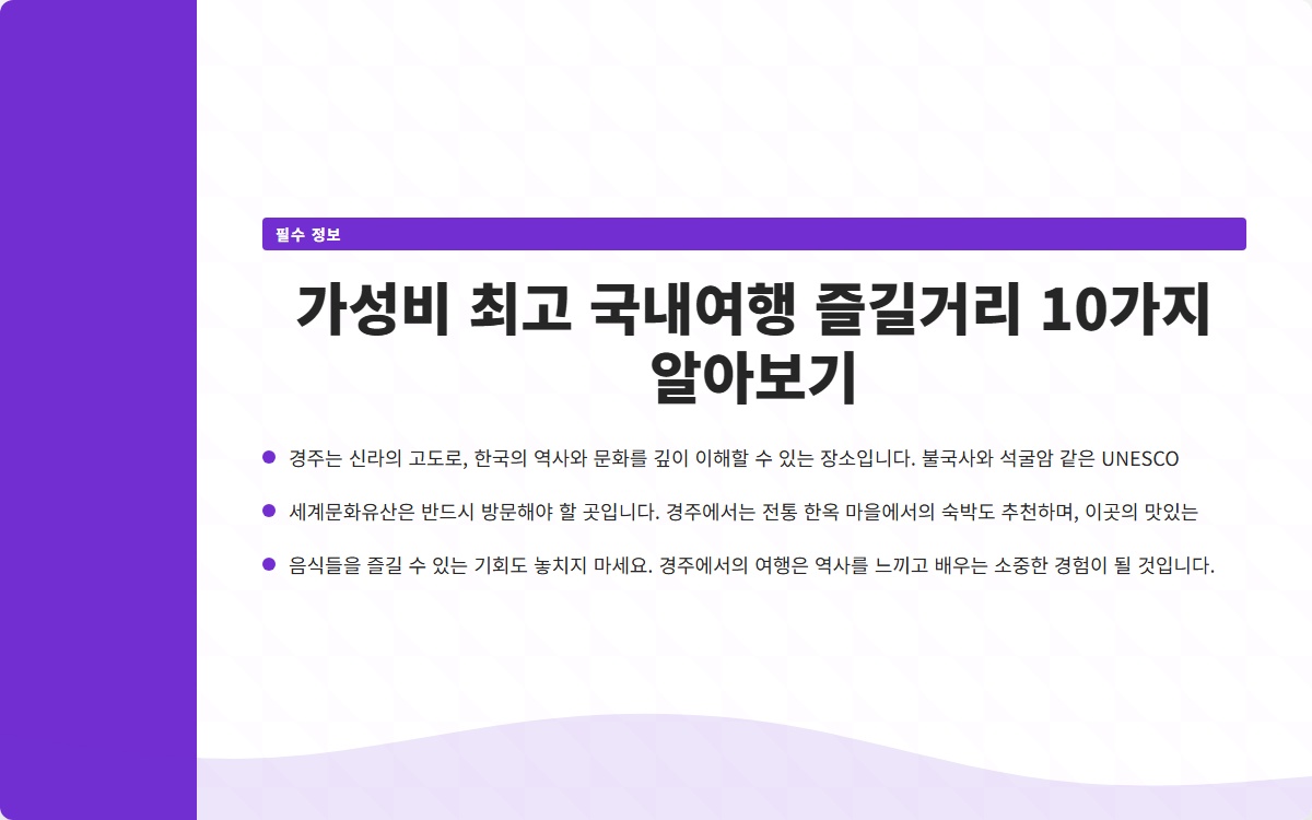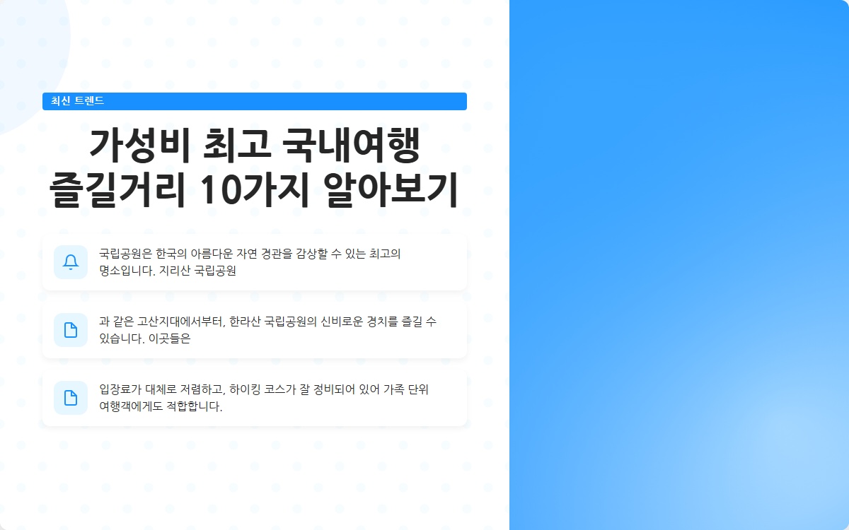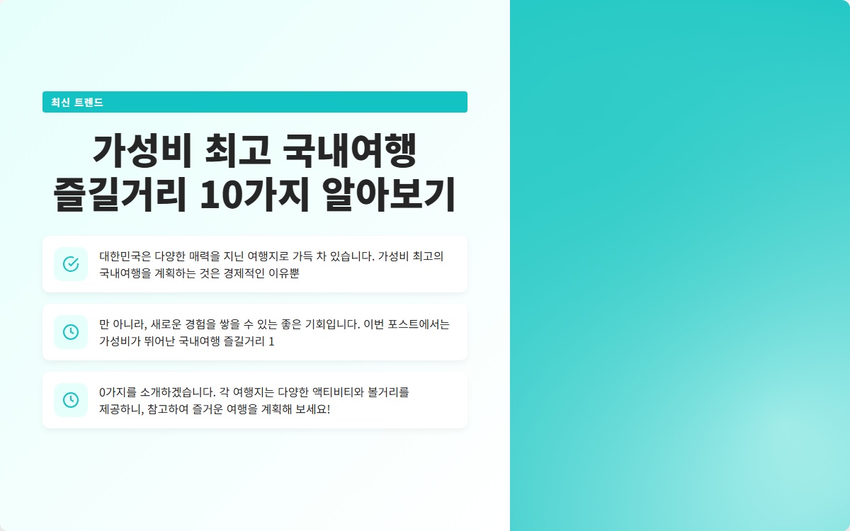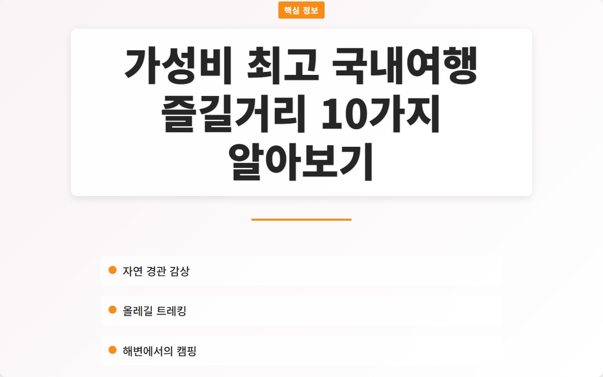 Tags: 국내여행, 제주도, 경주, 강릉, 부산, 서울, 가성비, 여행 팁, 문화 체험, 자연 여행