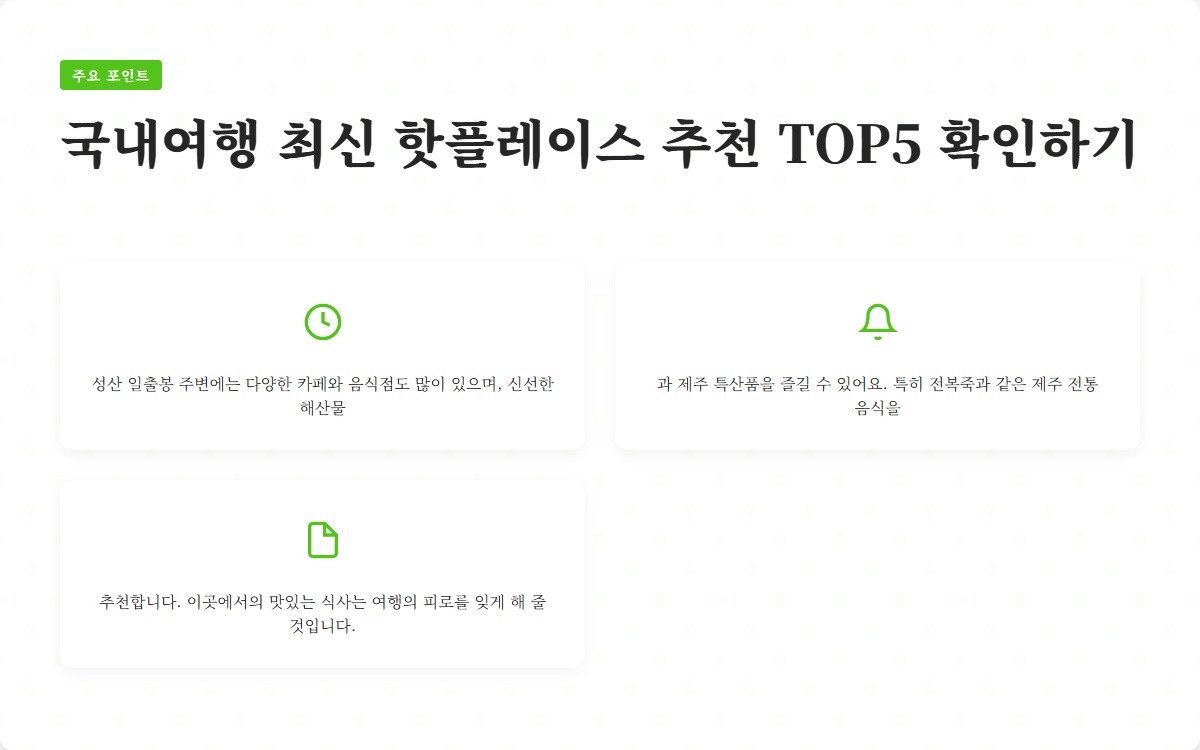 국내여행은 다양한 매력과 경험을 제공합니다. 위에서 소개한 핫플레이스들은 각기 다른 매력을 지니고 있어, 여러분의 여행 스타일에 맞는 장소를 선택할 수 있습니다. 소중한 순간을 만들어보세요! 이번 여행이 여러분에게 잊지 못할 추억이 되기를 바랍니다.