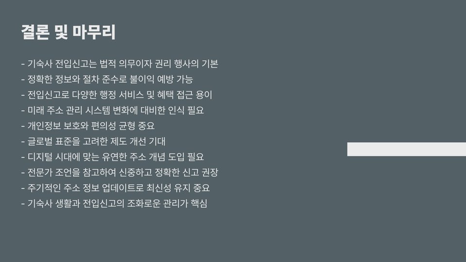 기숙사 전입신고는 간단하지만 매우 중요한 절차입니다. 본인의 주소를 정확히 등록하여 법적 문제를 피하고, 기숙사 생활을 보다 원활하게 할 수 있도록 하는 것이 중요합니다. 위에서 설명한 내용을 잘 숙지하고, 필요한 서류를 미리 준비하여 전입신고를 진행하세요. 전입신고는 기숙사 생활의 시작입니다! 기숙사 생활을 즐기며 유익한 시간을 보내길 바랍니다.