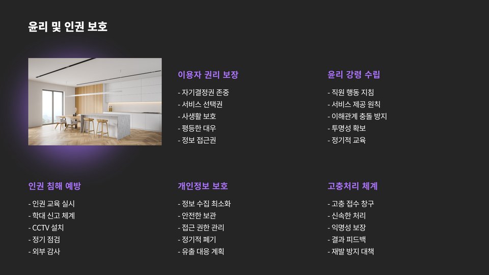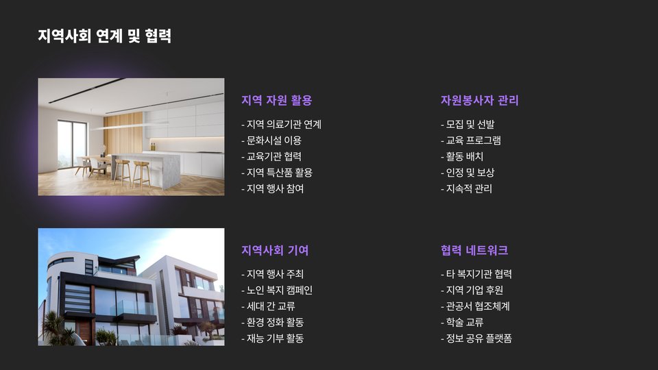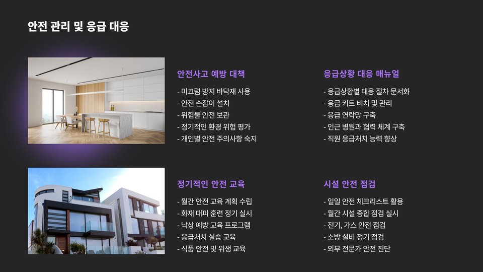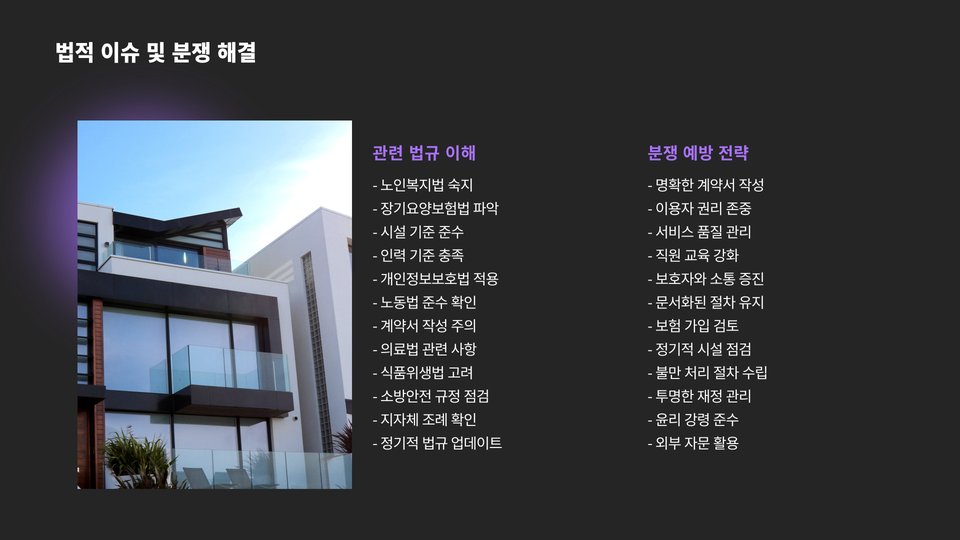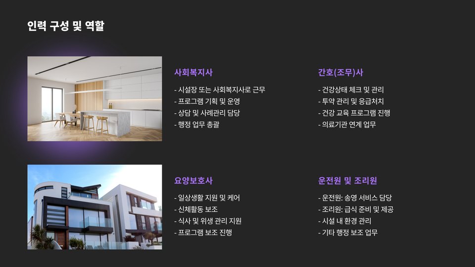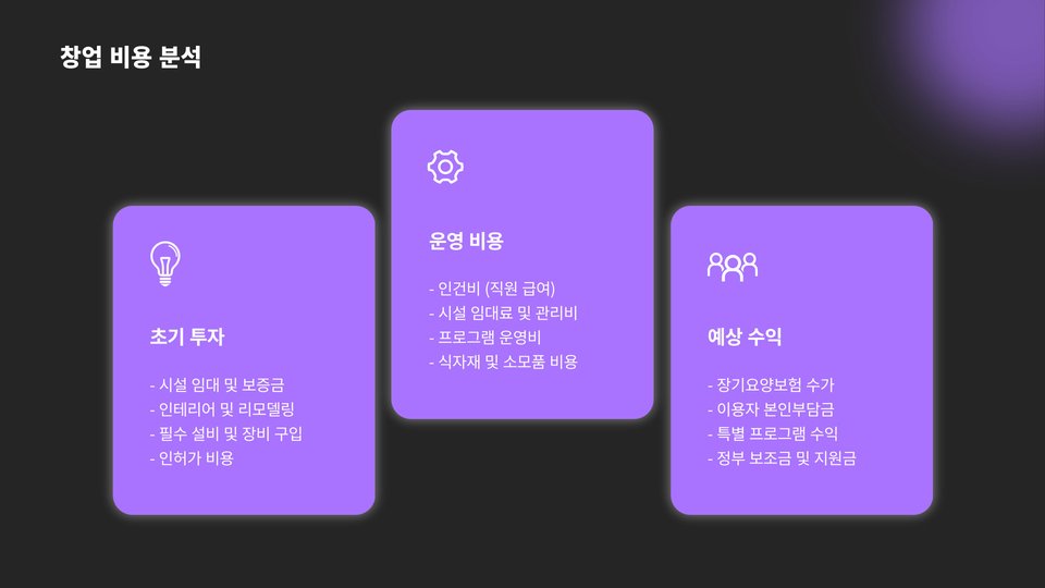 또한, 시설 개선 및 장비 구매 비용도 고려해야 합니다. 노인들을 위한 안전하고 편안한 시설을 제공하기 위해 필요한 장비를 구매하는 데에 적지 않은 비용이 들 수 있습니다.