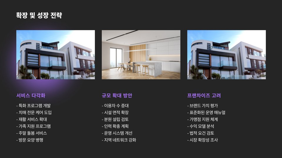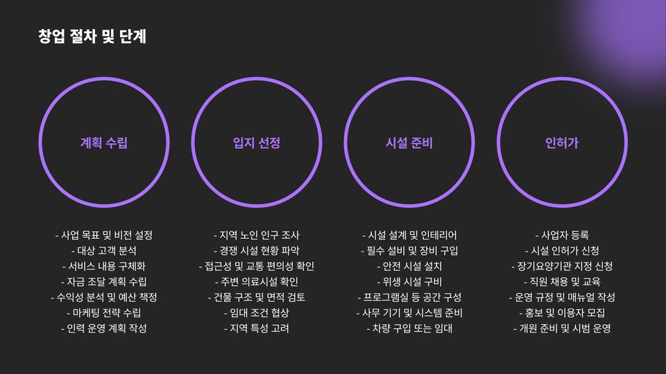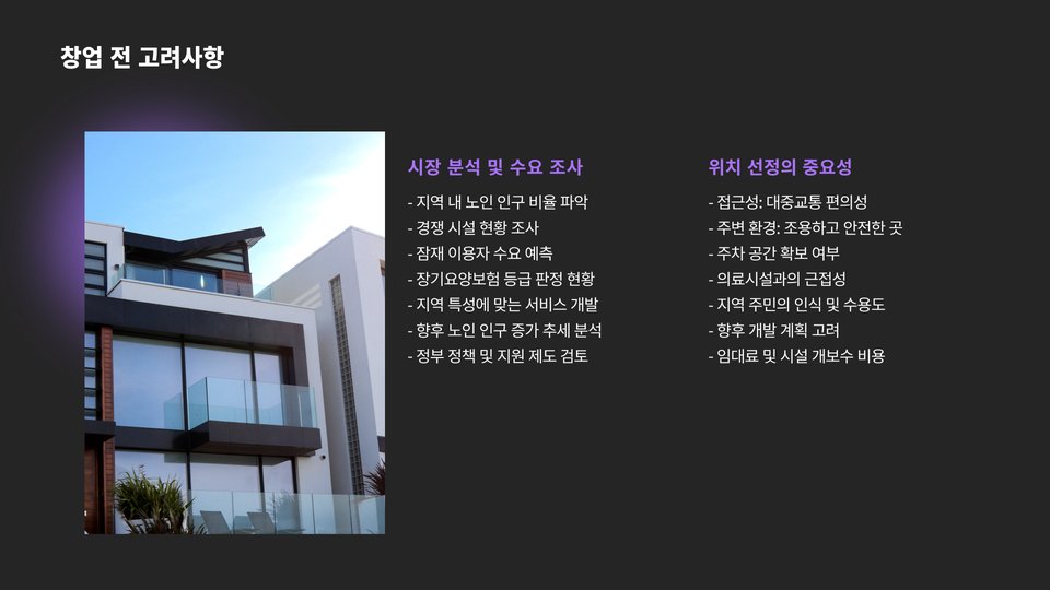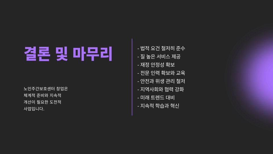 이와 같이, 노인주간보호센터 창업은 많은 요소를 고려해야 하는 복합적인 프로세스입니다. 필요한 지식과 정보를 잘 준비하고, 사전 준비를 통해 성공적인 창업을 이뤄내시길 바랍니다.