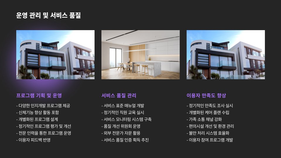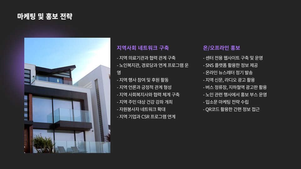 셋째, 마케팅 전략도 필수적입니다. 온라인 및 오프라인 채널을 통해 센터의 서비스와 활동을 홍보하여 더 많은 이용자를 확보해야 합니다.