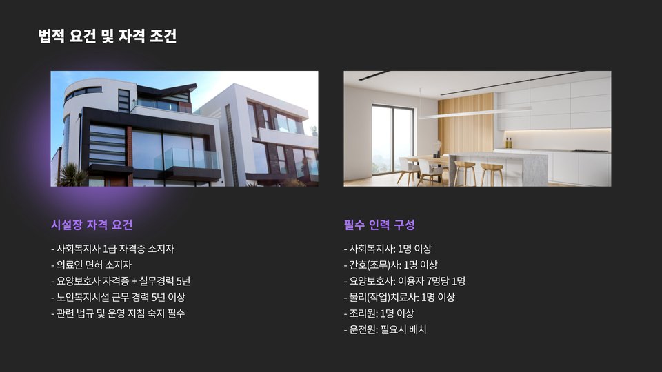 둘째, 전문 인력 확보가 중요합니다. 고령자 지원의 전문성을 갖춘 인력은 센터 운영의 핵심입니다. 이들 각각의 자격증 및 경력에 대한 검증이 필요하며, 안전한 환경을 제공할 수 있도록 교육을 지속적으로 실시해야 합니다. 관련 분야 경력 1년 이상이 요구됩니다.