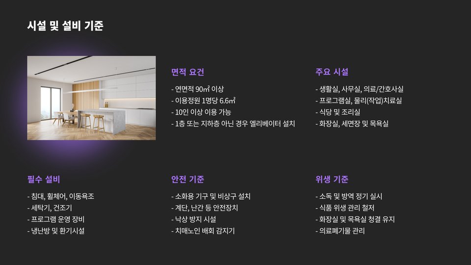두 번째 조건은 시설 기준입니다. 안전하고 쾌적한 환경을 제공하기 위해 일정한 면적과 시설 기준을 충족해야 하며, 이는 지역 보건소의 검사를 통과해야 가능합니다.