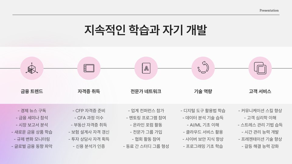 | 지속적인 학습 | 최신 정보 습득 및 기술 강화 |