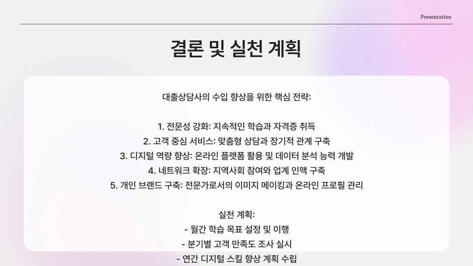 결론적으로, 대출상담사가 수입을 향상시키기 위해서는 수수료 구조 이해, 고객 관리 전략, 자기계발이 필수적입니다. 각 요소를 효과적으로 조합하여 지속 가능한 성장을 이루어야 할 것입니다. 이러한 전략을 통해 대출상담사는 자신의 직업뿐만 아니라, 자신의 수익 성과를 극대화할 수 있는 계기를 마련할 수 있을 것입니다.