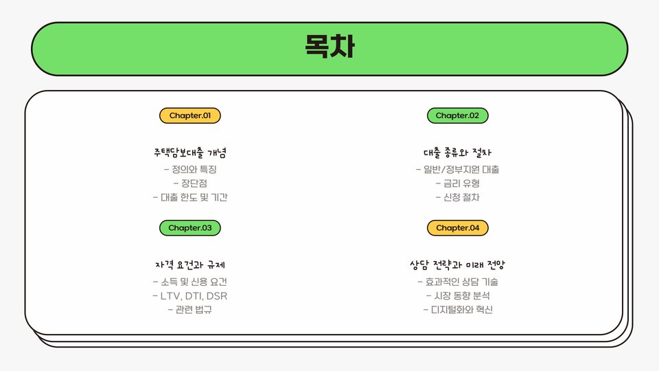주택담보대출 상담은 단순한 금융 서비스가 아닌, 고객의 재정적인 미래를 결정짓는 중요한 과정입니다. 전문가로서의 지식과 경험을 바탕으로 고객에게 최상의 서비스를 제공해야 합니다. 이를 통해 고객의 신뢰를 얻고, 긍정적인 금융 경험을 만들어 나갈 수 있습니다.