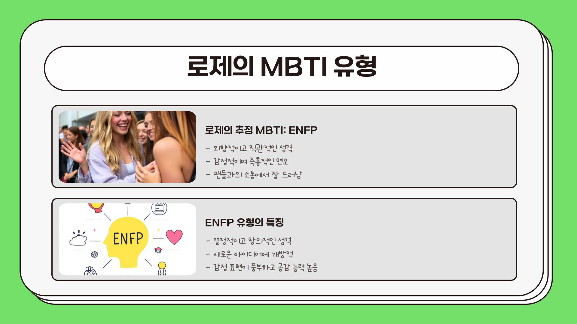 - 로제의 MBTI는 ENFP로, 외향적이고 창의적인 성격을 가짐.