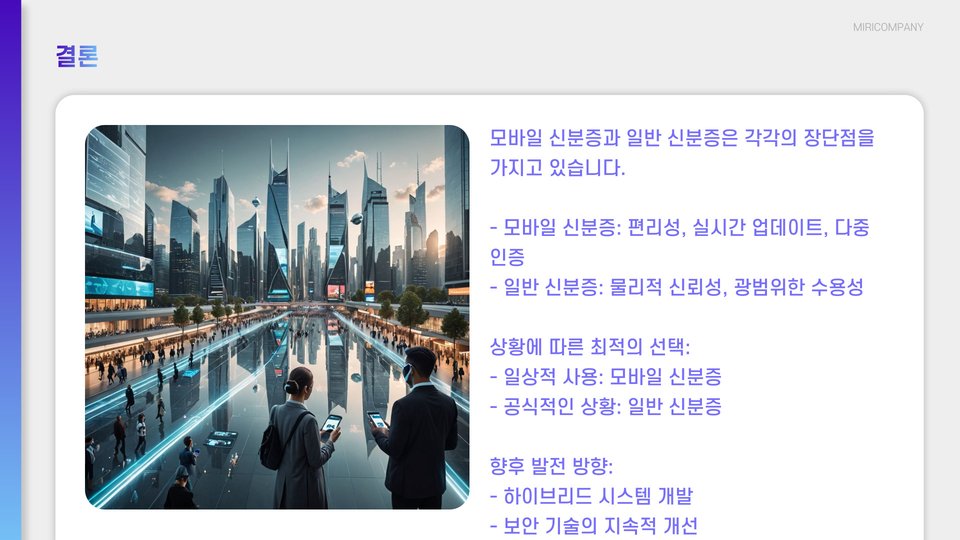 결론적으로, 모바일 신분증과 종이 신분증은 각각의 특성과 장점을 가지고 있습니다. 모바일 신분증은 편리함과 보안성에서 높은 점수를 받고 있으며, 특히 손쉬운 접근성과 다양한 보안 기술이 적용되어 있습니다. 반면, 종이 신분증은 여전히 많은 사람들이 선호하는 형태로, 법적 요구나 특정 상황에서 그 사용이 불가피할 수 있습니다.