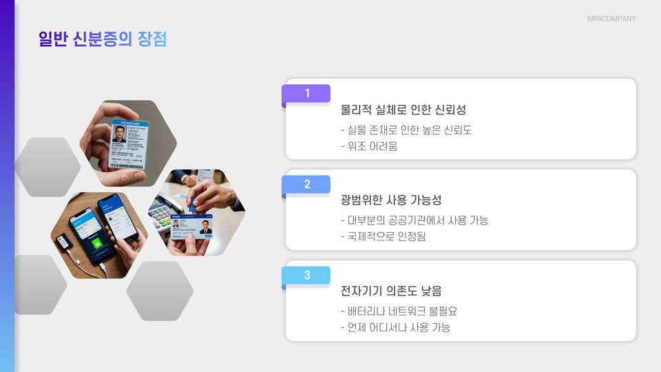 | 종이 신분증 | 형식의 명확성, 비대칭적 사용 가능, 물리적 존재 | 분실 시 어려움, 관리 번거로움 |
