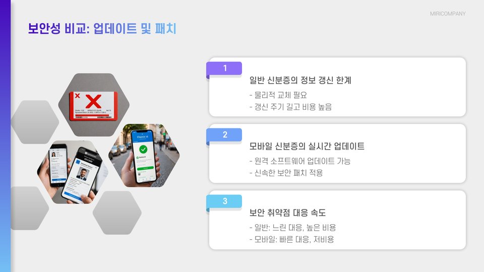 세 번째 장점은 즉각적인 업데이트입니다. 만약 사용자의 개인 정보가 변경되면, 모바일 신분증은 신속하게 업데이트할 수 있어 공식적으로 필요한 서류를 즉시 반영할 수 있습니다. 이는 종이 신분증에서는 불가능한 장점입니다.