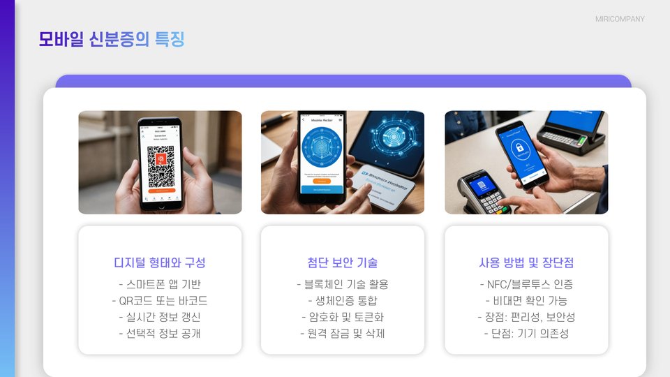 | 모바일 신분증 | 휴대성, 높은 보안, 즉각적인 업데이트 | 기술 의존성, 접근 장애 발생 가능성 |