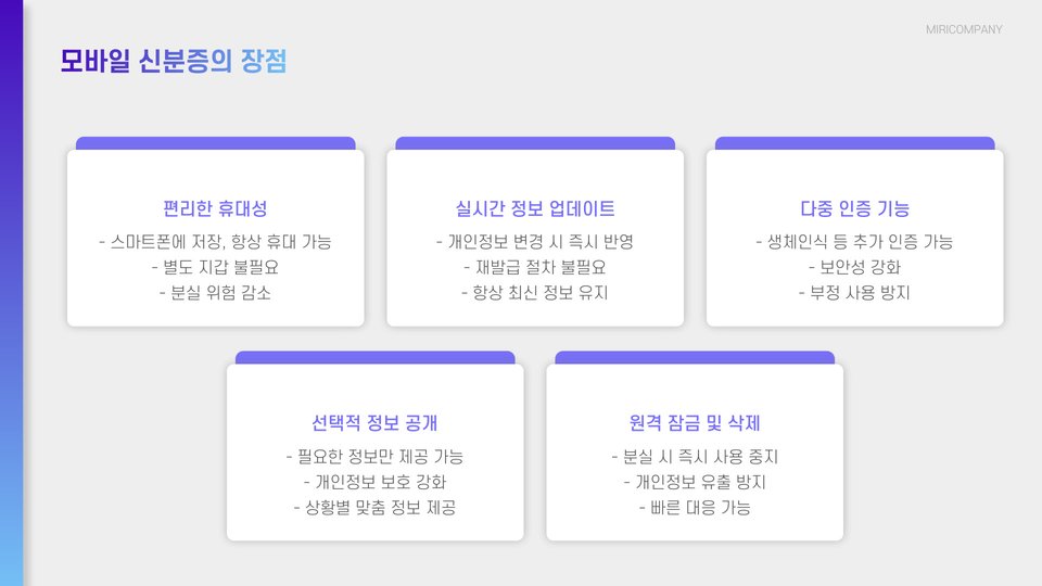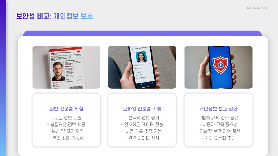 | 모바일 신분증 | 휴대성, 높은 보안, 즉각적인 업데이트 | 기술 의존성, 접근 장애 발생 가능성 |