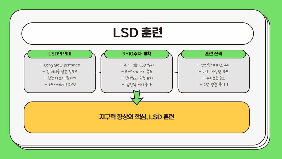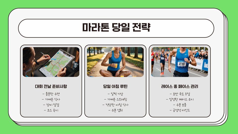 훈련을 시작하기 전에 구체적인 훈련 계획을 세우는 것이 중요합니다. 목표 날짜를 정하고, 그에 맞춰 주간 훈련 일정을 만들면 좋습니다. 이 계획에는 다양한 훈련 유형이 포함되어야 하며, 예를 들어 지구력 훈련, 인터벌 훈련, 회복 훈련 등을 포함할 수 있습니다. 주 3~4회 정도의 훈련을 목표로 하되, 각 훈련의 강도를 조절하는 것이 중요합니다. 초보자라면 적당한 강도로 시작하여 점차 강도를 높여가는 것이 좋습니다.