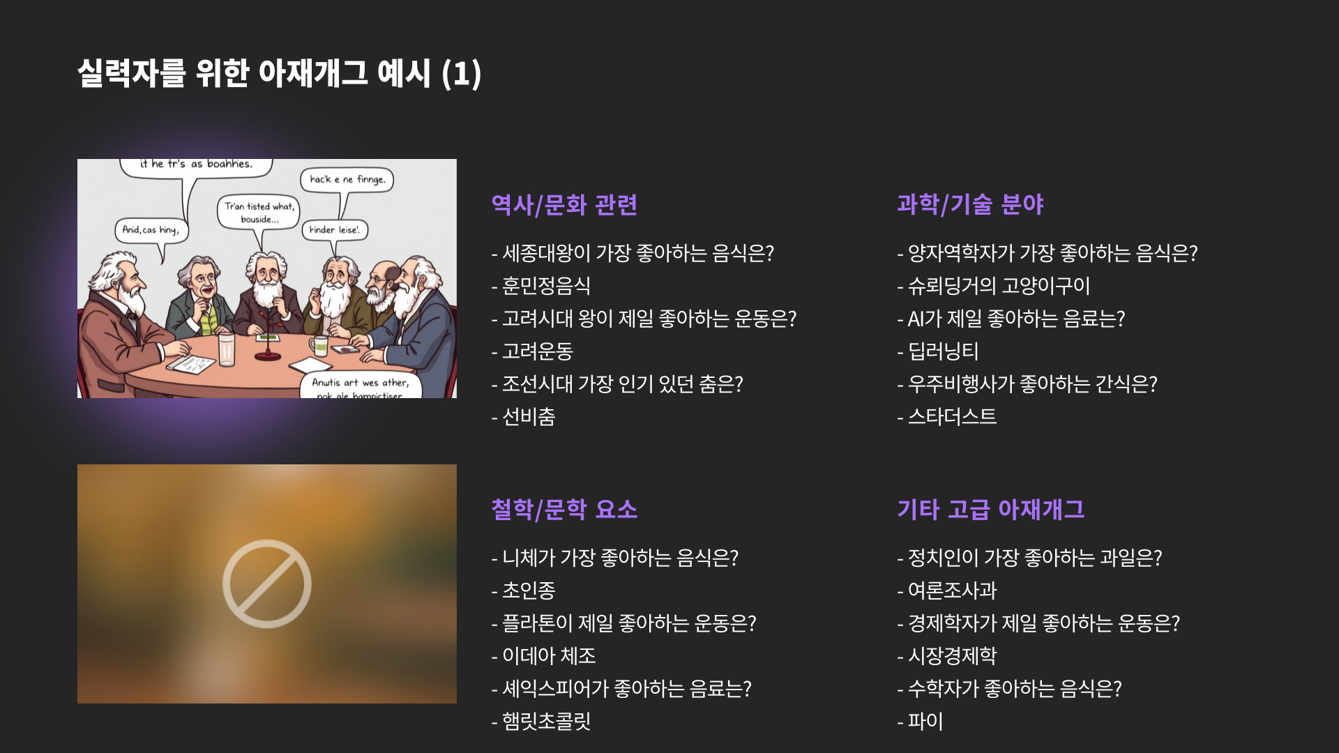 이제 다양한 어려운 아재개그 예시를 통해 여러분이 즐길 수 있는 방법을 소개하겠습니다. 이러한 개그들은 때로는 난해할 수도 있지만, 그만큼 재치있고 실행 가능성이 높습니다. 예를 들어: