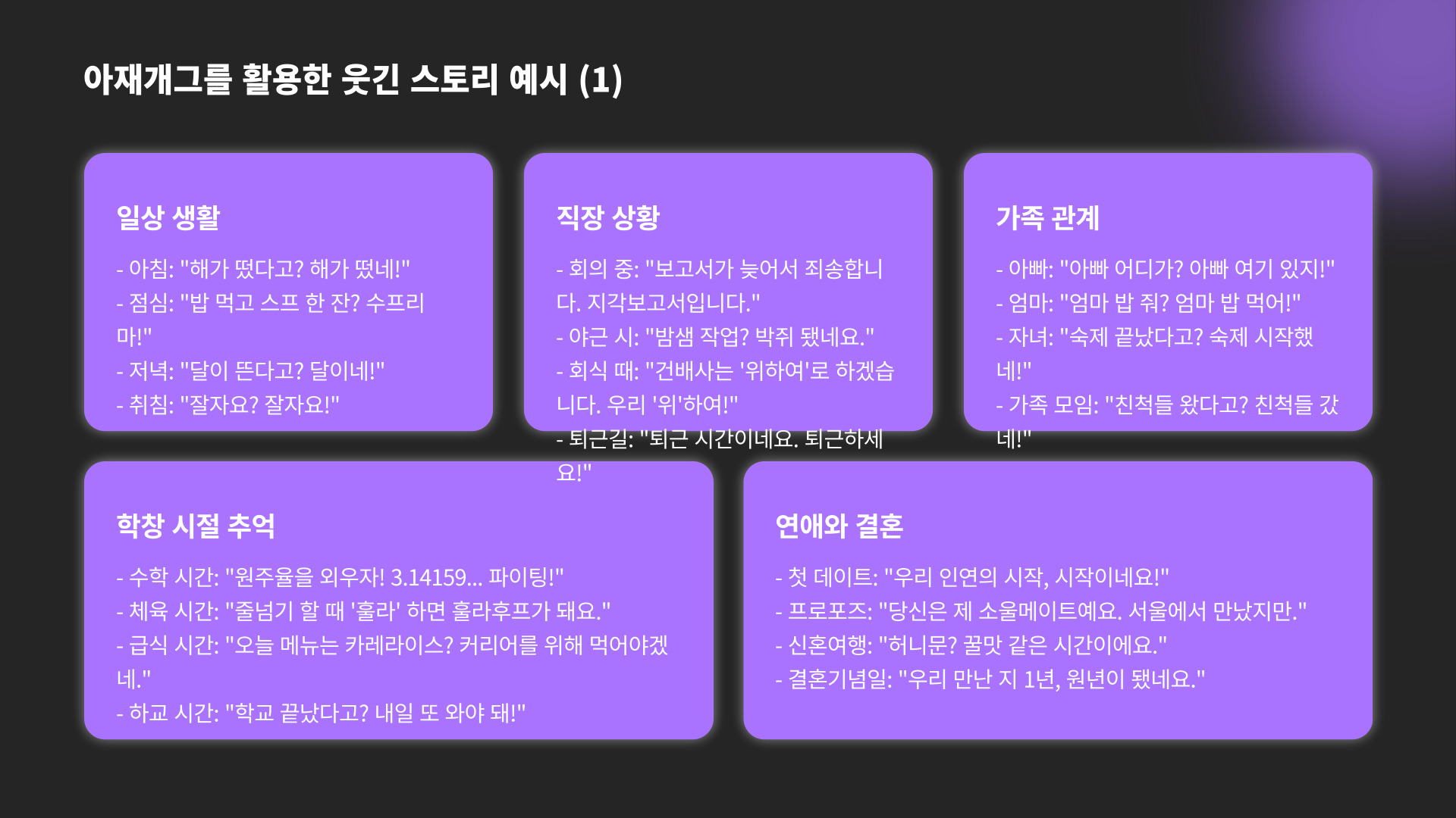 - 아재개그는 단순한 유머를 넘어서 사회적 연결을 형성한다.