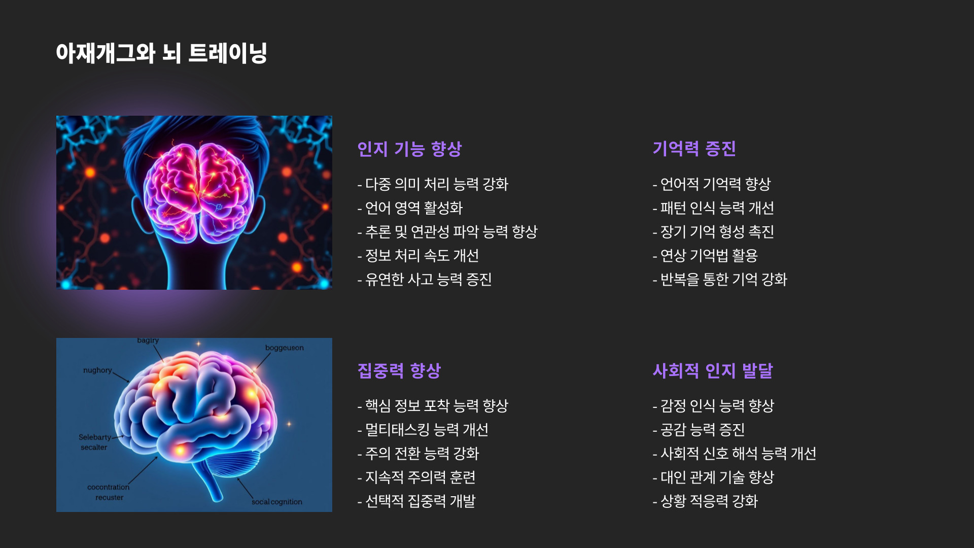 아재개그는 단순히 웃음을 주는 것을 넘어서, 뇌를 자극하는 효과가 있습니다. 개그를 이해하고, 그 배경을 파악하는 과정에서 뇌는 더욱 활성화됩니다. 이러한 과정은 집중력을 높이고, 창의적인 사고를 촉진합니다. 특히 친구들과의 대화를 통해 서로의 반응을 살펴보며, 어떤 유머가 더 재미있는지를 파악하는 것도 중요한 요소입니다.