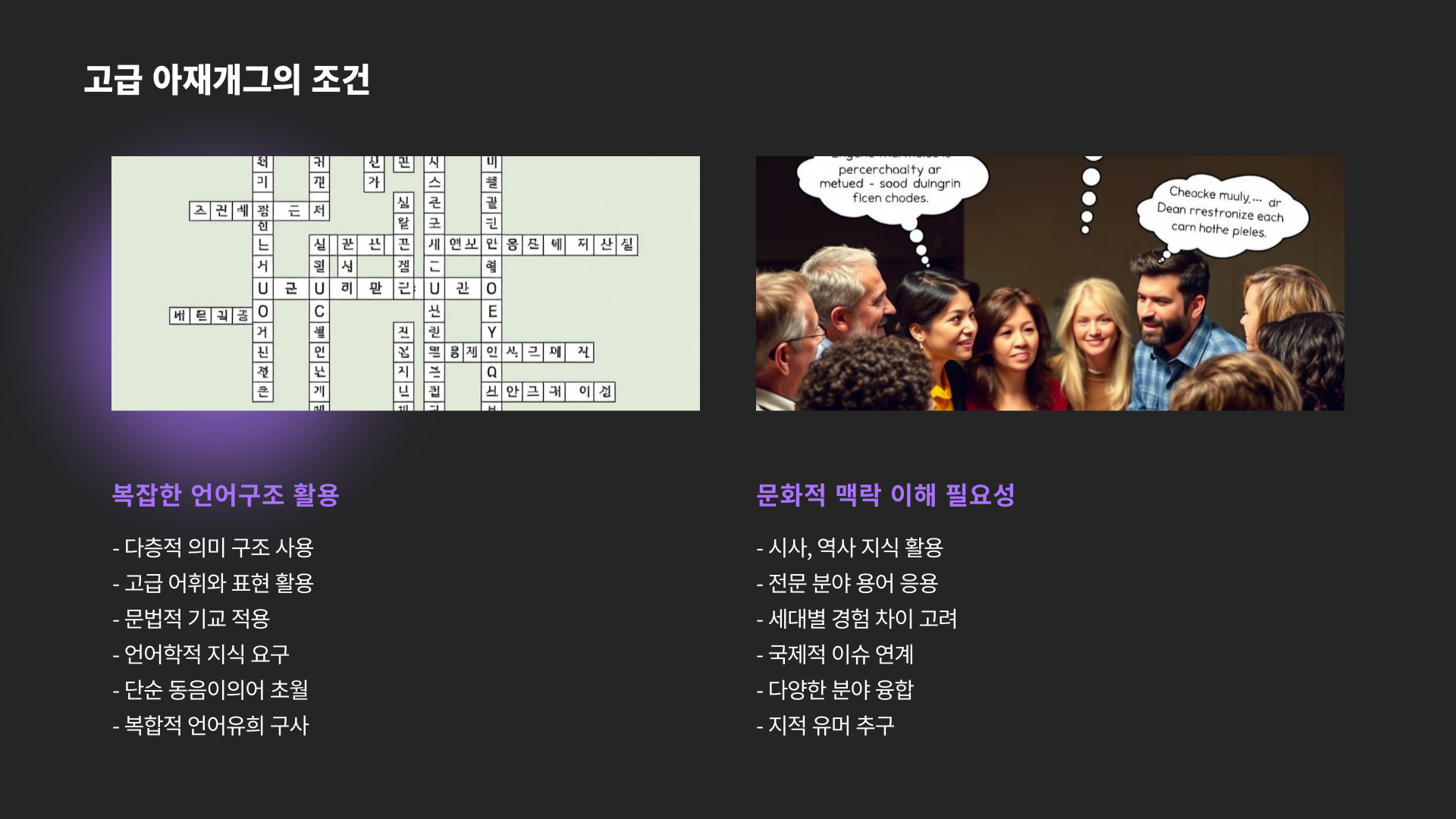 이번에는 조금 더 어려운 아재개그를 소개하겠습니다. 이러한 개그들은 생각을 요구하고, 때로는 반전이 있어 더욱 재미있습니다. 아래는 몇 가지 예시입니다: