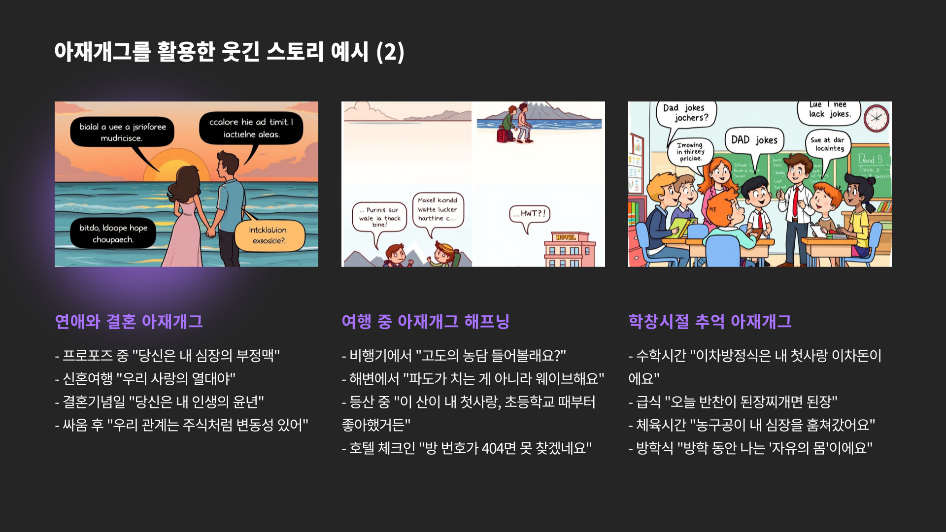 - 상황에 맞는 유머를 선택하세요. 무거운 분위기에서는 가벼운 유머가 효과적입니다.