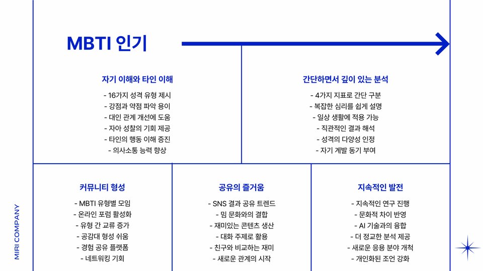 - MBTI: 성격 유형을 분류하여 개인의 특성을 이해합니다.