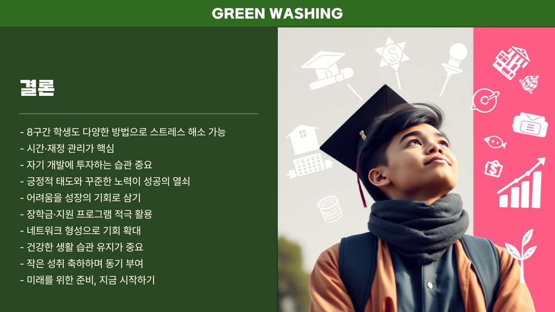 - 스트레스 해소를 위한 계획적 관리 필요