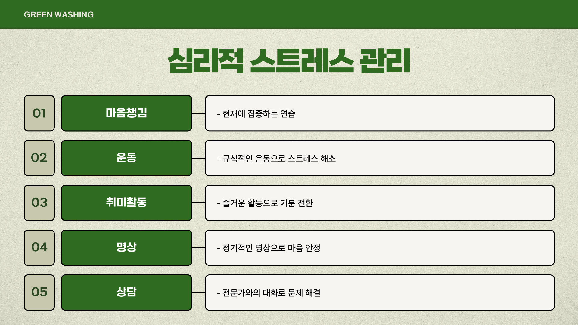 마지막으로, 스트레스를 해소하기 위한 적절한 대책이 필요합니다. 긴장된 마음을 풀 수 있는 방법으로는 규칙적인 운동 또는 취미생활을 통해 긴장을 해소하는 것도 좋은 방법입니다. 할 수 있는 것부터 실천해보세요.