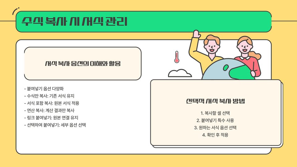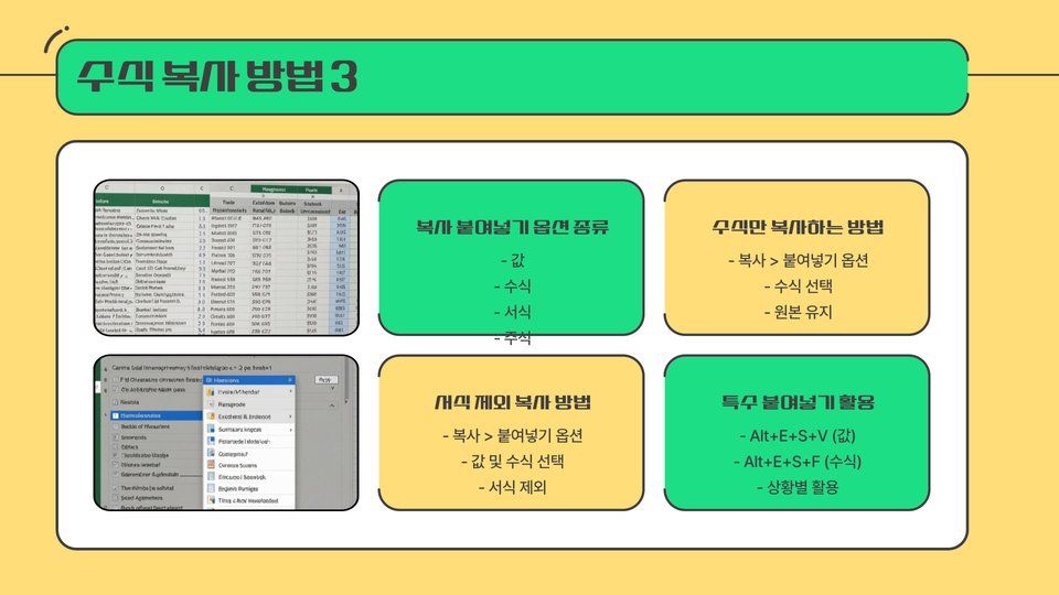- 특수 붙여넣기: 복사한 수식을 붙여넣을 때, 수식만 붙여넣거나 값만 붙여넣는 등 다양한 옵션을 제공하여 필요한 내용을 선택적으로 붙여넣을 수 있습니다.