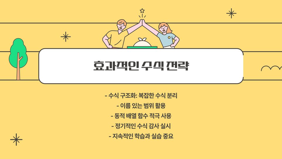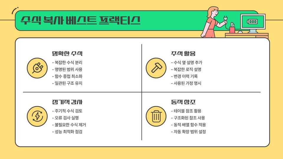 두 번째로, 반복 작업 최소화를 위해 자주 사용하는 수식은 템플릿으로 저장하는 것이 좋습니다. 이것은 시간을 절약하고 오류를 줄이는 데 큰 도움이 됩니다. 데이터를 정기적으로 업데이트하는 과정에서도 유용할 수 있습니다.