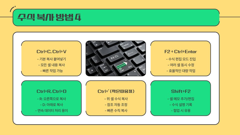 엑셀에서 수식을 복사하는 방법은 다양한 방식이 있습니다. 다음은 가장 일반적으로 사용되는 방법들입니다: