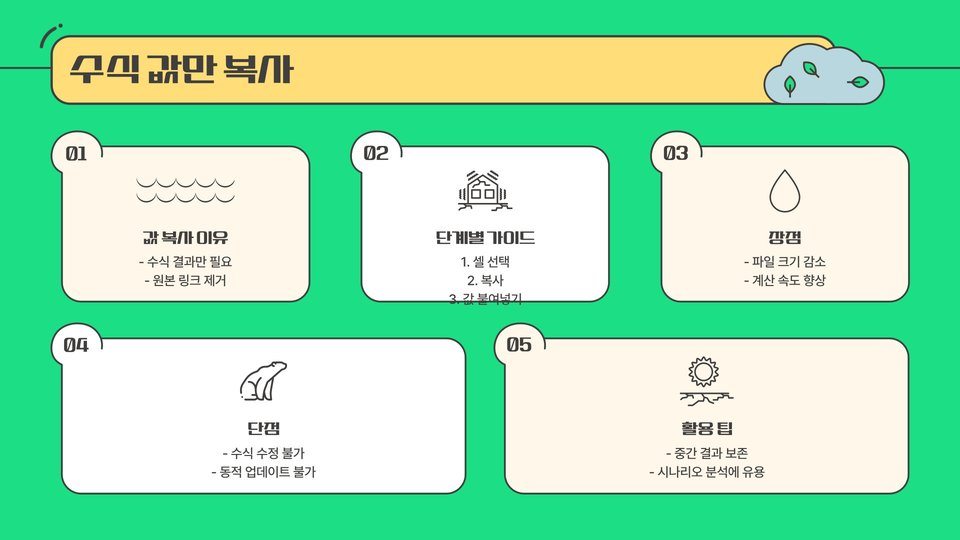 - 특수 붙여넣기 기능: 수식만, 값만 복사하여 붙여넣는 것이 가능합니다.