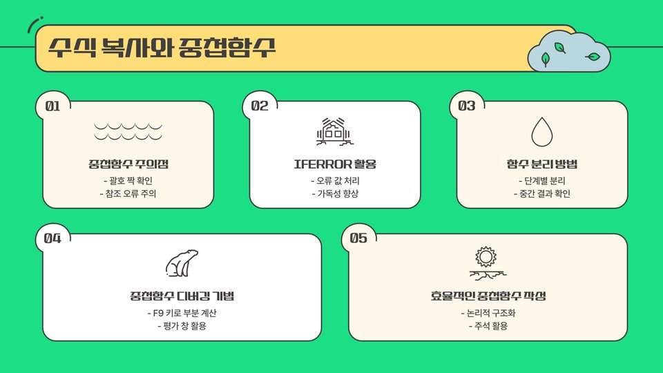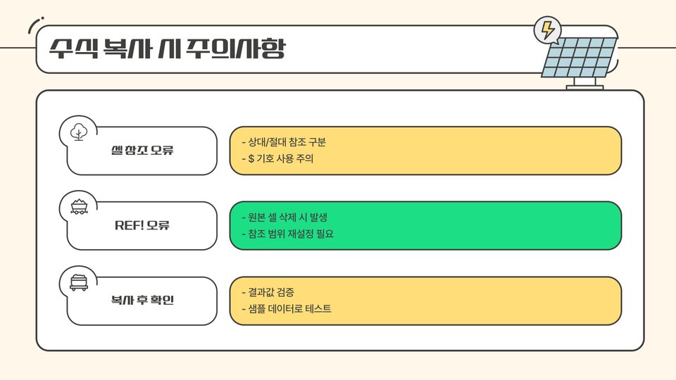 수식을 복사할 때는 몇 가지 유의해야 할 사항이 있습니다. 먼저, 원본 데이터의 정확성을 확인하는 것이 중요합니다. 수식을 복사할 때, 원본 데이터가 잘못되면 복사한 수식도 잘못된 결과를 낼 수 있습니다. 또한, 셀 서식을 함께 복사해야 할 경우, 서식 복사 도구를 활용하는 것이 좋습니다. 이러한 점들을 고려하여 수식을 복사하면 더욱 정확한 결과를 얻을 수 있습니다.