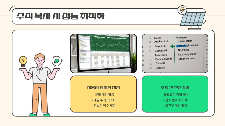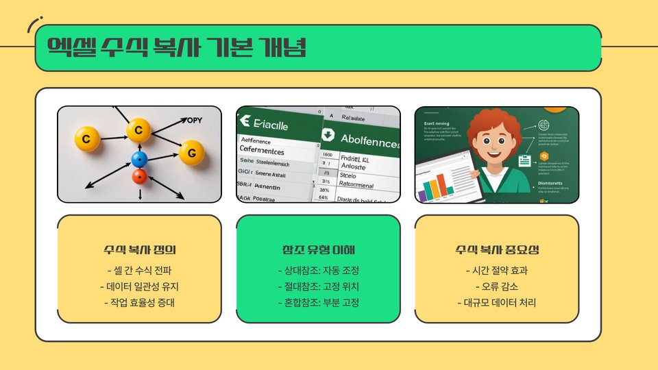 엑셀에서 수식을 복사하는 것은 단순히 셀의 값을 복사하는 것과는 다릅니다. 수식 복사 시, 상대 참조와 절대 참조의 개념을 이해하는 것이 중요합니다. 상대 참조는 복사된 셀의 위치에 따라 수식의 참조가 변경되는 방식이고, 절대 참조는 복사 후에도 항상 같은 셀을 참조하도록 고정하는 방식입니다. 이러한 개념을 명확히 이해하면, 수식 복사할 때 발생할 수 있는 오류를 최소화할 수 있습니다.