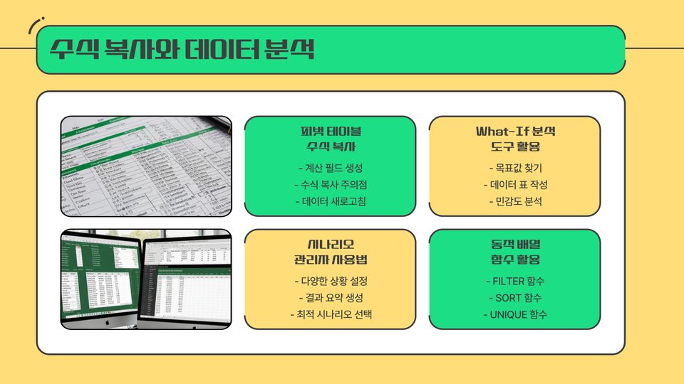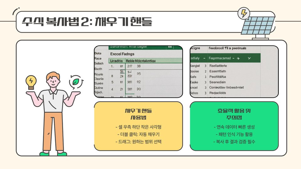 - 필 핸들: 작은 사각형을 드래그하여 수식을 복사할 수 있는 가장 기본적인 도구입니다.