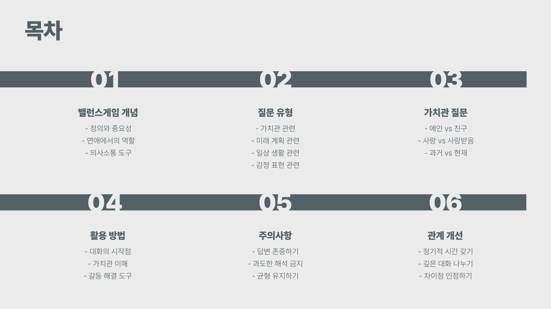 연애 밸런스게임은 단순한 질문과 답변을 넘어 서로의 생각을 공유하고 감정을 나누는 기회입니다. 이 게임을 통해 상대방의 가치관, 취향, 그리고 삶의 목표를 파악할 수 있습니다. 이런 정보는 상대방을 더욱 깊이 이해하는 데 큰 도움이 됩니다. 특히, 상대의 생각을 존중하고 대화로 풀어가는 과정은 관계를 더욱 돈독하게 만들 수 있습니다.