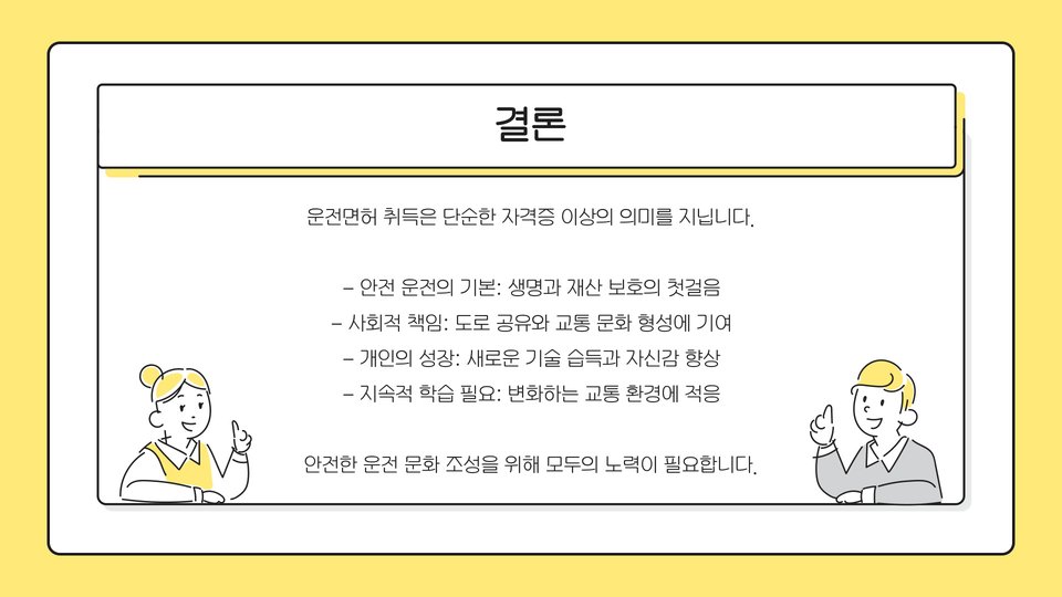 결론적으로, 운전면허는 독립적이고 책임 있는 운전자가 되기 위한 첫걸음입니다. 면허를 취득하기까지의 과정은 결코 짧지 않지만, 그 속에 담긴 경험은 여러분의 인생에서 소중한 자산이 될 것입니다. 이 글을 통해 더욱 철저히 준비하고, 안전한 운전을 통해 좋은 경험을 쌓아 나가길 바랍니다.