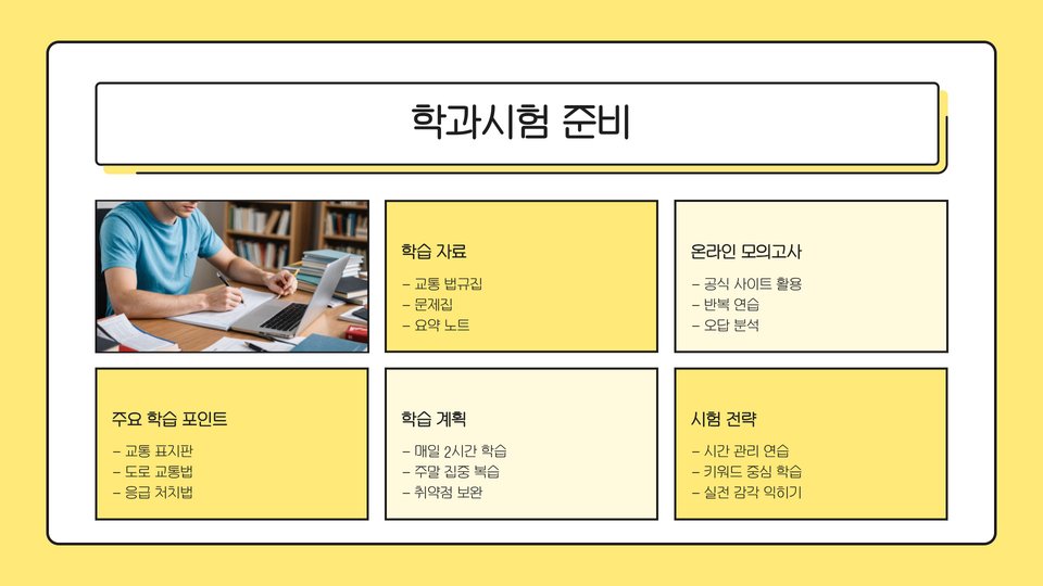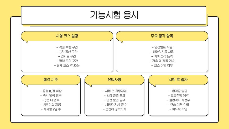 시험 준비는 긴 과정을 통해 이루어지며, 특히 긴장을 줄이기 위해 시뮬레이션 실습을 하는 것이 좋습니다. 여러 번의 모의시험을 통해 실제 시험 환경에 익숙해지면 긴장을 덜 수 있습니다. 또한, 다양한 교차로 주행, 주차 연습, 후진 등을 충분히 연습해야 합니다. 자주하는 실수는 특히 주의해야 합니다.