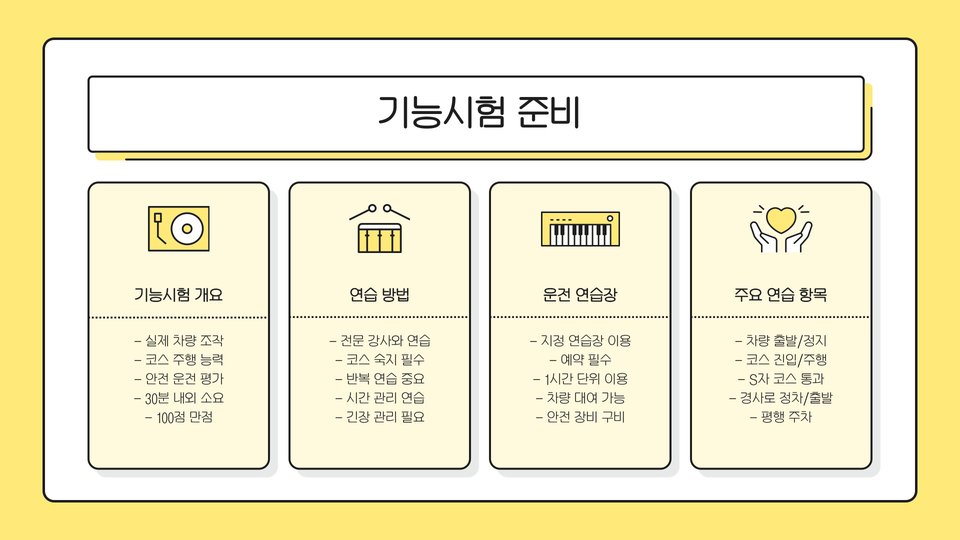 - 운전면허 취득 과정은 이론 교육, 필기시험, 실기 교육, 실기시험으로 이루어집니다.