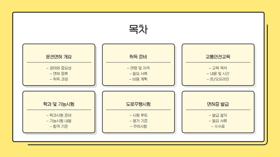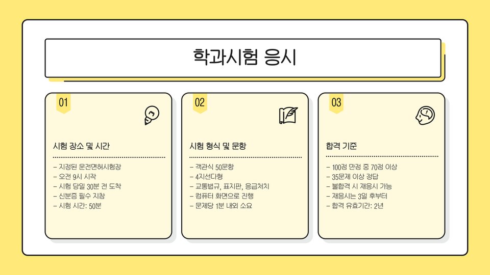 - 운전면허 취득을 위한 과정: 학과 교육 → 필기시험 → 실기 교육 → 면허시험