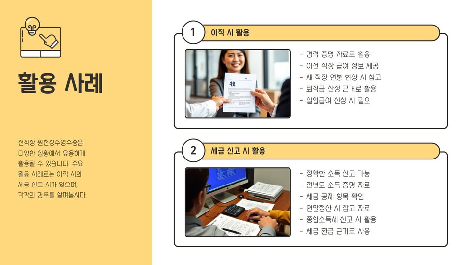 특히 전직장 원천징수영수증은 이직 시 유용하게 사용됩니다. 이직하는 경우, 새로운 직장에 이전 직장에서의 소득과 세금 납부 내역을 쉽게 전달할 수 있어, 소득이 연속적으로 이어짐을 명확히 할 수 있습니다. 그래서 이직한 후에도 원활한 세금 처리를 도울 수 있는 중요한 프로세스입니다.