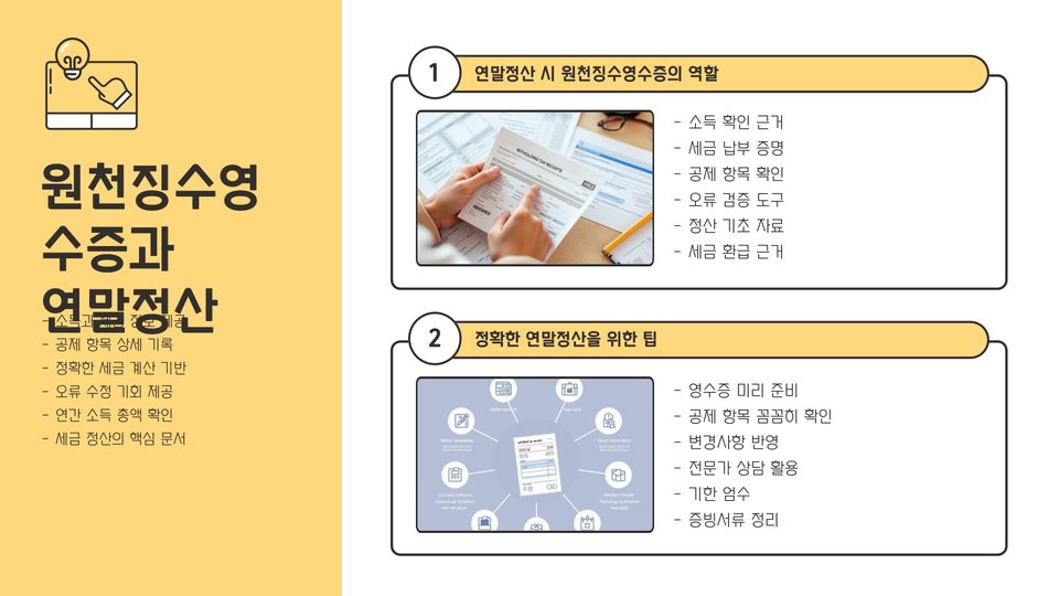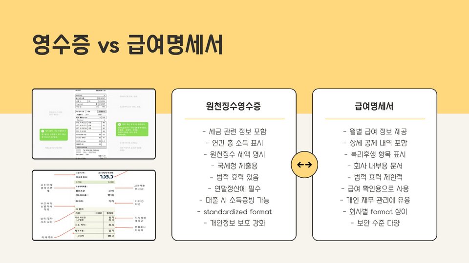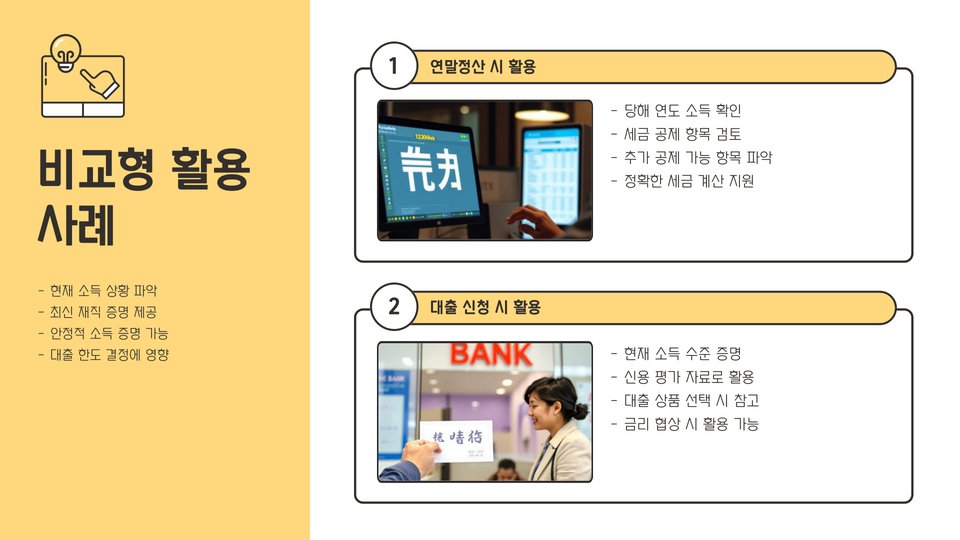 또한, 비교형 원천징수영수증은 특히 연말정산 시 유용합니다. 매월 들어오는 소득과 세금 정보를 종합해 연말에 정리하더라도, 불필요한 세금 신고 과정을 줄이고 소득세 환급이 가능할 수 있습니다. 이와 함께, 변화하는 세법에 대한 적시 대응이 가능하다는 장점도 있습니다.