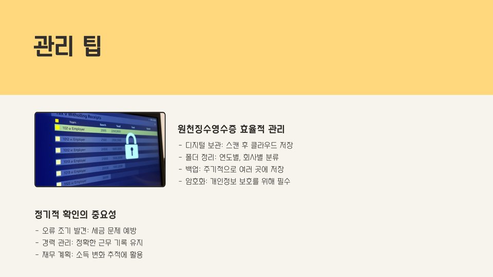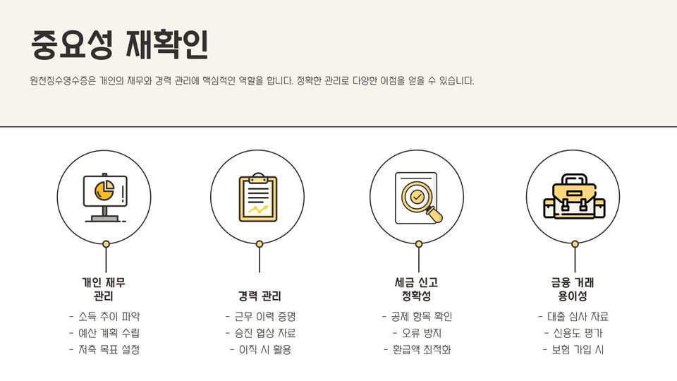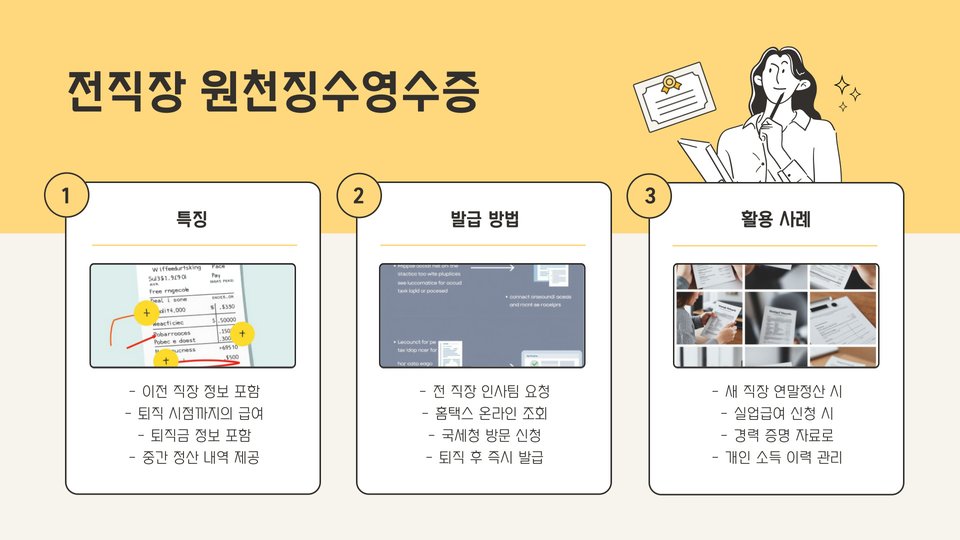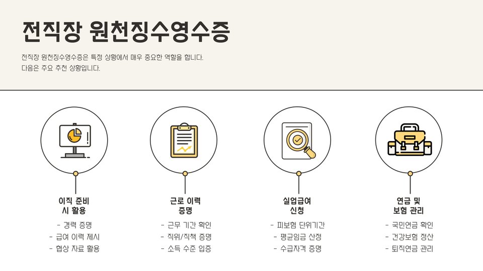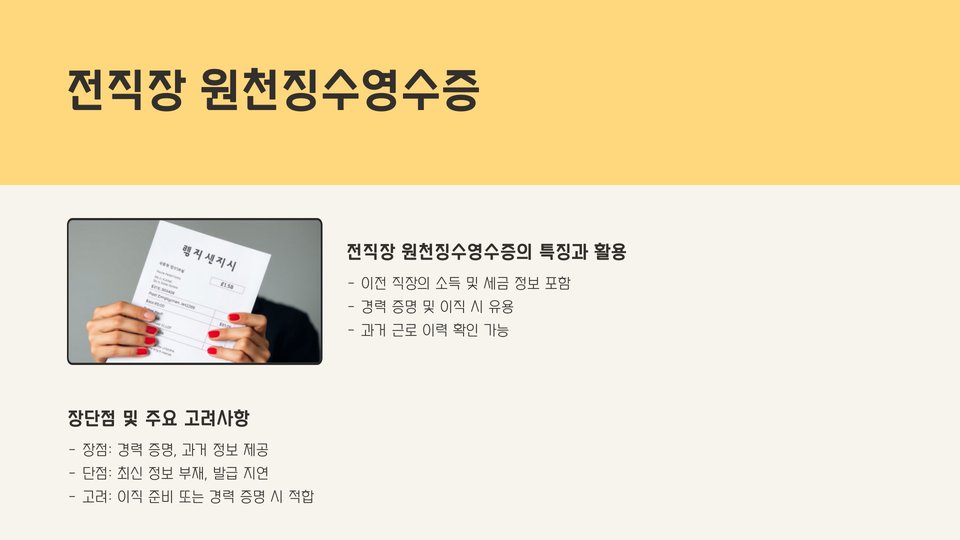 특히 전직장 원천징수영수증은 이직 시 유용하게 사용됩니다. 이직하는 경우, 새로운 직장에 이전 직장에서의 소득과 세금 납부 내역을 쉽게 전달할 수 있어, 소득이 연속적으로 이어짐을 명확히 할 수 있습니다. 그래서 이직한 후에도 원활한 세금 처리를 도울 수 있는 중요한 프로세스입니다.