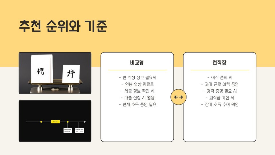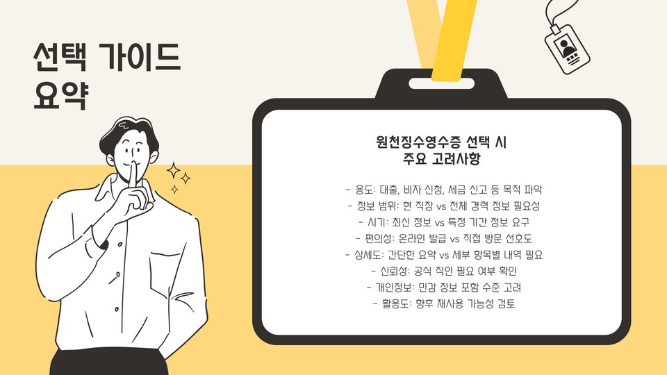 이제 두 종류의 원천징수영수증에 대해 살펴보았으니, 어떤 상황에서 어떤 서류를 선택해야 할지 고민해 봅시다. 비교형 원천징수영수증은 여러 직장을 다니는 경우에 적합하며, 다양한 소득을 한 번에 비교할 수 있는 장점이 있습니다. 반면, 전직장 원천징수영수증은 한 직장에서 장기간 근무한 경우에 필요하며, 세액공제를 고려할 때 유리합니다.