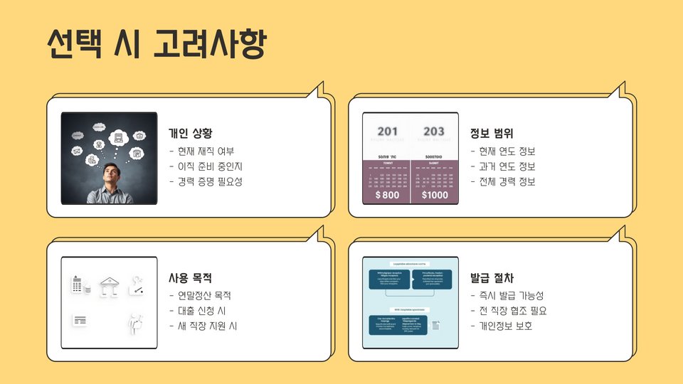 그러나 반대로 최근에 이직을 했거나 단일 직장에서만 일하는 경우라면 전직장 원천징수영수증이 더 적합할 수 있습니다. 이직 후 이전의 소득과 세금 내역을 간편하게 관리할 수 있기 때문입니다.