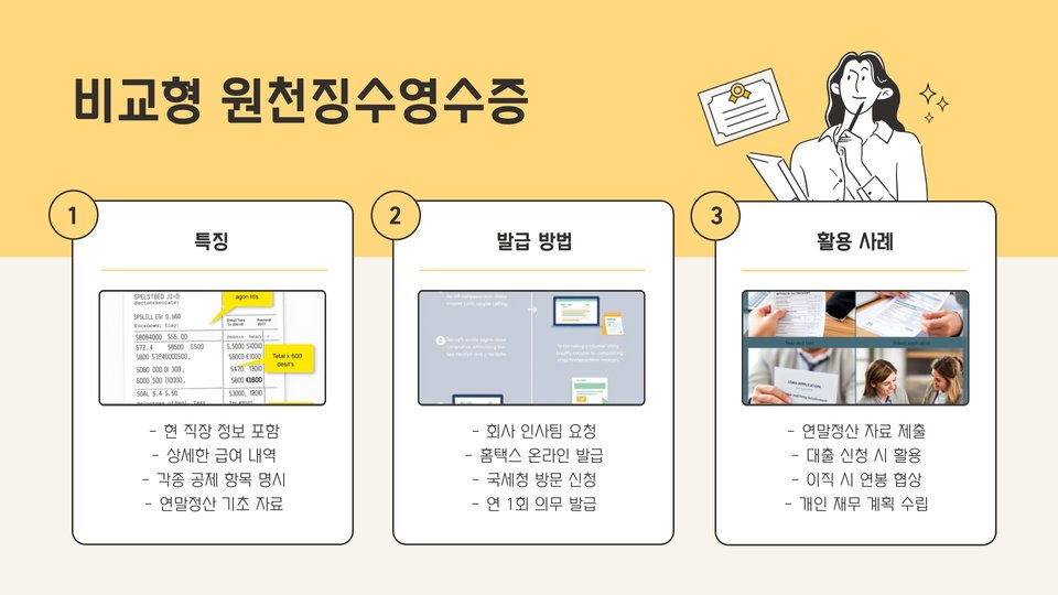 | 비교형 원천징수영수증 | 여러 소득원을 가진 개인 | 소득 종합 관리 용이 |