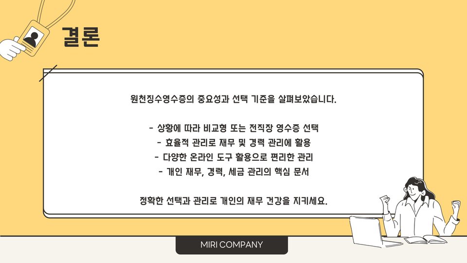 각각의 특징과 장단점을 잘 이해하고 자신의 재정 상황 및 직무 이력을 고려하여 적절한 영수증을 선택하는 것이 중요합니다. 필요에 따라 회계사나 세무 전문가와 상담하여 지원을 받는 것도 좋은 방법입니다.