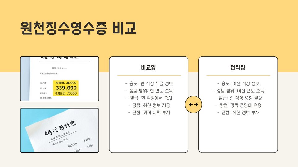 원천징수영수증은 근로소득자에게 필수적인 세무 서류로, 각종 소득세 및 지방세에 대한 원천징수를 증명하는 중요한 문서입니다. 하지만 원천징수영수증에도 여러 종류가 있으며, 그 중에서도 비교형 원천징수영수증과 전직장 원천징수영수증이 있습니다. 두 가지 유형의 차이점을 이해하고 어떤 상황에서 어떤 서류를 선택해야 하는지 알아보겠습니다.