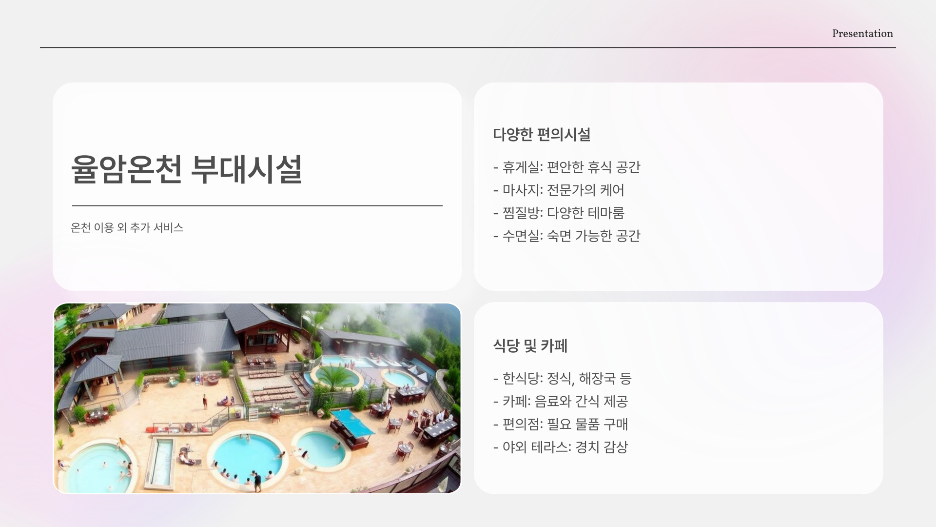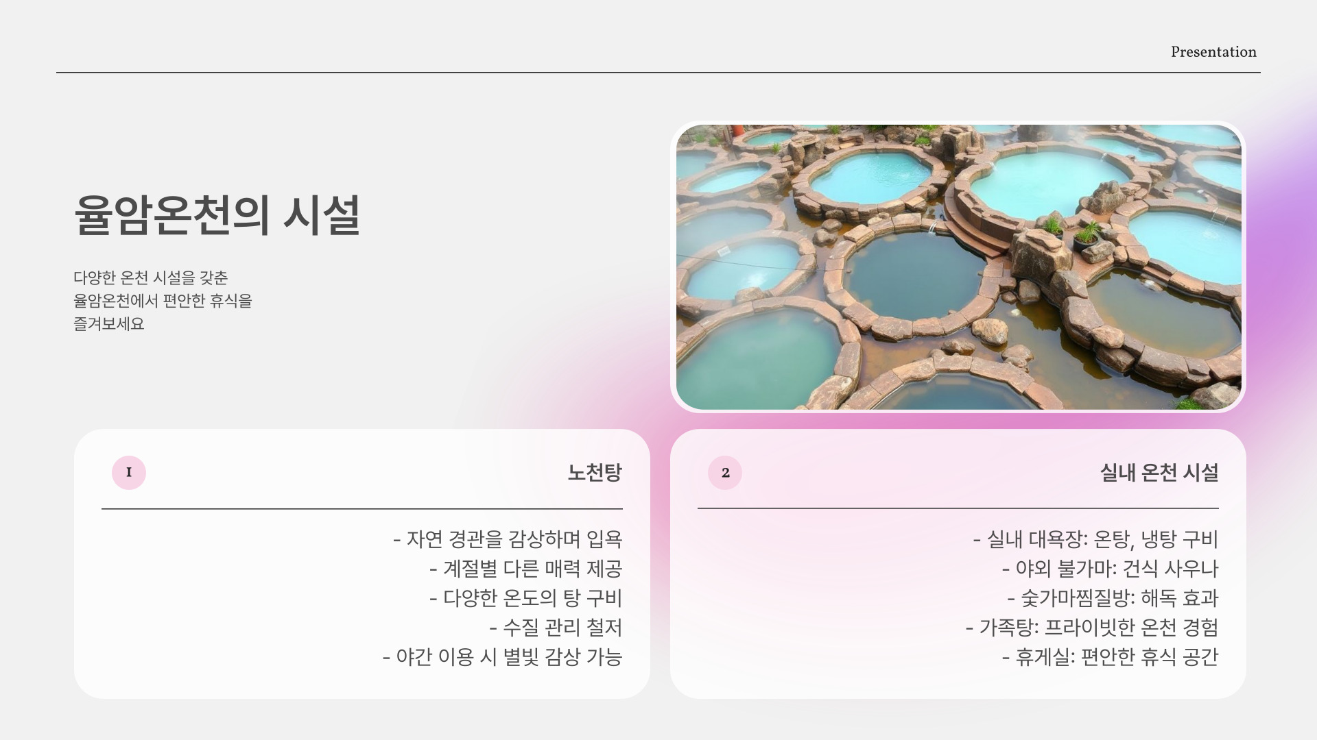 율암온천 노천탕에서의 특별한 경험은 단순한 온천욕을 넘어섭니다. 주변의 경치를 감상하며 느긋하게 시간을 보내는 것은 현대인에게 큰 활력소가 됩니다. 특히, 자연의 소리와 함께하는 명상은 마음을 가라앉히고, 일상에서의 스트레스를 잊게 해줍니다. 또한, 온천욕 후에는 주변의 맛집을 탐방하거나, 산책로를 따라 걷는 것도 좋은 마무리가 됩니다.