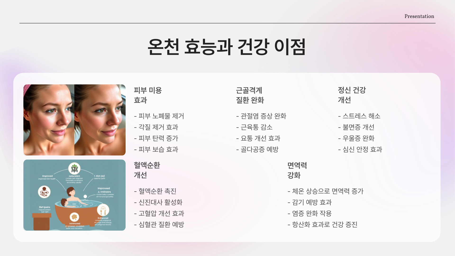 - 온천수의 효능은 피부 건강과 피로 해소