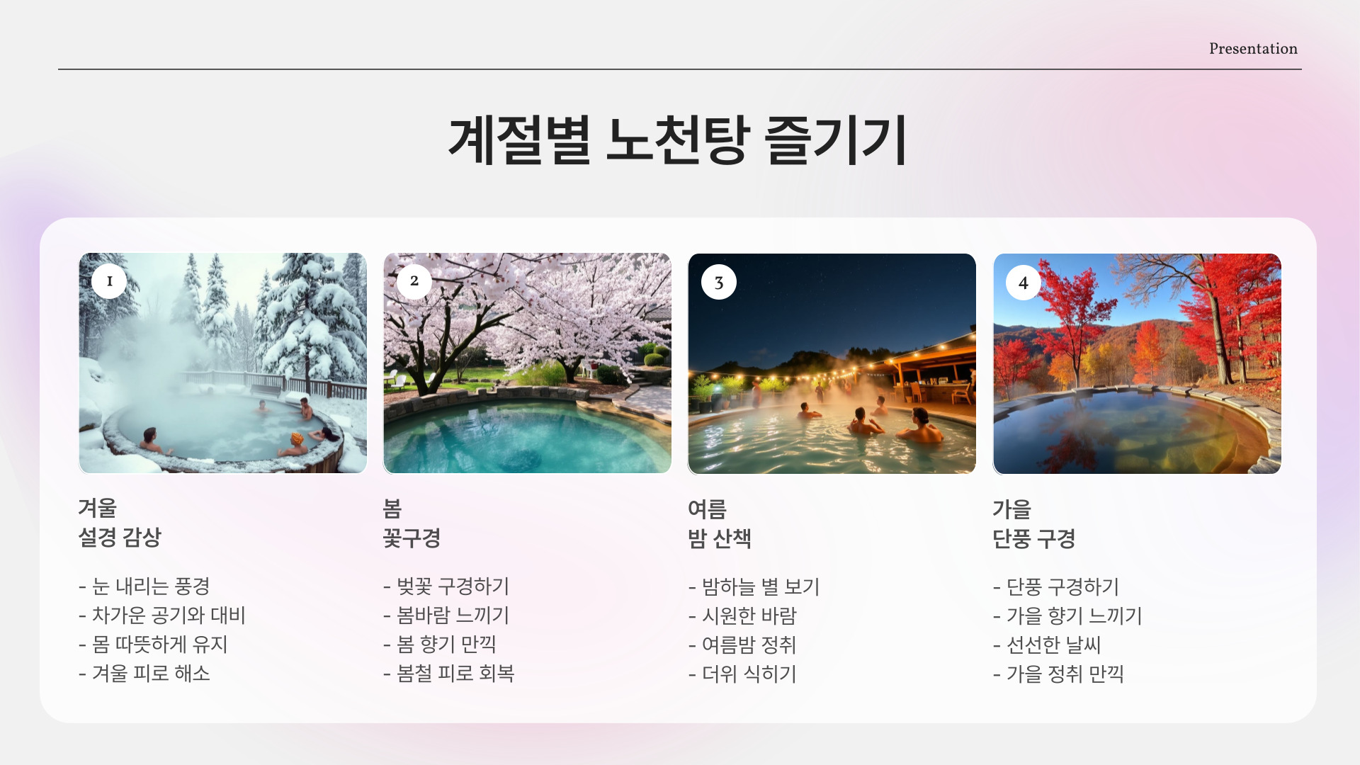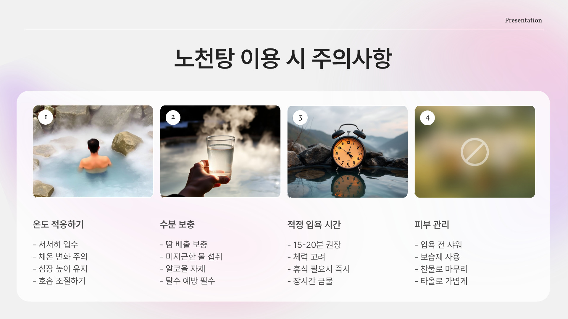 중요 팁: 노천탕에서는 음주를 자제하고, 개인의 건강 상태에 맞게 이용하는 것이 좋습니다.