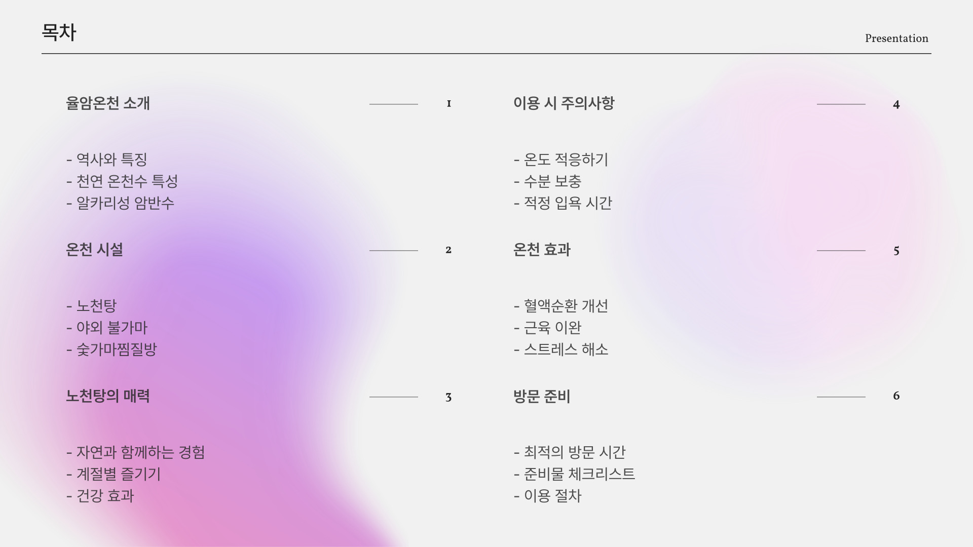 율암온천 노천탕에서의 경험은 단순한 휴식이 아니라, 몸과 마음의 힐링과 재충전의 기회를 제공합니다. 온천에 관한 다양한 정보와 팁을 통해 자신의 경험을 더욱 풍성하게 할 수 있습니다. 온천욕을 통해 새로운 힐링의 경로를 경험해 보세요!